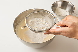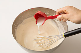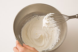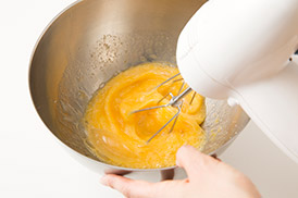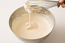 泡立て器ですくうとゆっくり落ちて生地が重なりリボン状になるまで、<02>をハンドミキサーでさらにしっかりと泡立てます。
