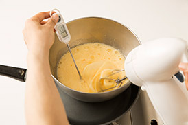 湯せんにかけてハンドミキサーで泡立てます。卵液が人肌(36度くらい)になったら、湯せんからはずします。
