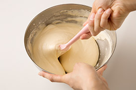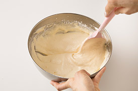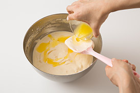 <05>に溶かしバターをゴムベラに伝わせて回し入れ、底からよく混ぜ合わせます。