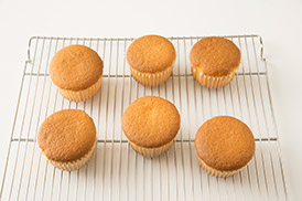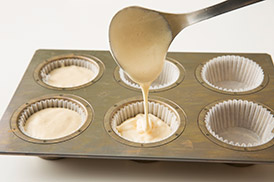 <06>の生地をマフィン型にお玉で八分目まで流し入れます。