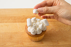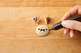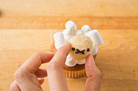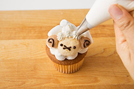 <10>で絞ったクリームの正面に<11>の鈴カステラの顔とつのをのせます。