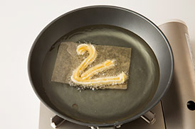 揚げている途中でオーブンペーパーがはがれてきたら菜箸で取り出してね!