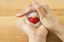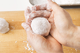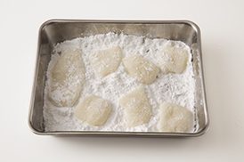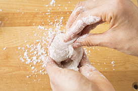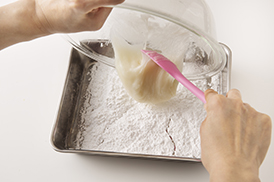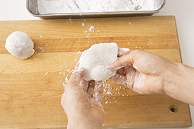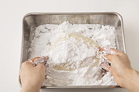 片栗粉をたっぷり全体にまぶすことで、生地が乾燥するのを防ぐよ!