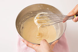 絵をかくために固めの生地に仕上げるよ。牛乳は全量入れずに残しておこう!