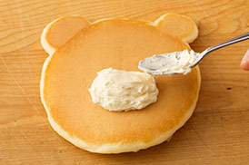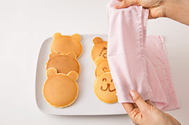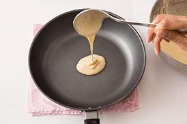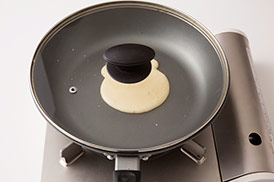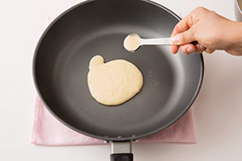 パンケーキの大きさは直径8cmくらいが目安だよ!ぬれ布巾の上に置くことで、ムラなくきれいに焼けるんだ!