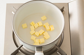 バターを1cm角に切り、水と塩を鍋に入れて中火にかけます。