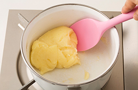 <01>が沸騰したら薄力粉Aを一気に加え、すぐに火を止めてゴムベラで鍋底から混ぜ合わせます。