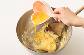 残りの卵を少しずつ加えながら、木べらで混ぜます。