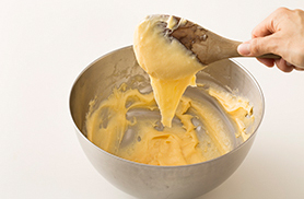 木べらで生地をたっぷりすくい、ゆっくりと下に落ちた後、木べらからたれた生地が10cmくらいの三角形になったらOK。