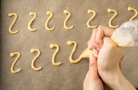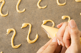 まず生地を絞り出し袋に入れて先を細く切り、オーブンシートに逆S字型に絞り出します。最初の部分が頭になるので少しふくらみをもたせます。