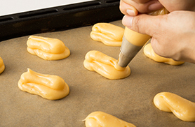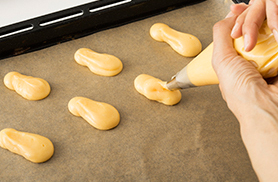 残りの生地を、直径1cmの丸口をつけた絞り出し袋に入れ、オーブンシートを敷いた天板に、しずく型に12個絞り出します。
