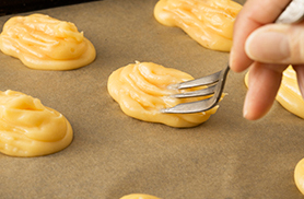 <11>の生地に、水にぬらしたフォークですじをつけていきます。