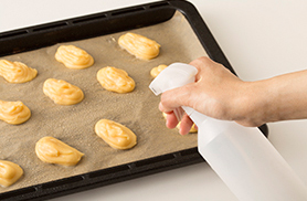 30cm離れたところから霧吹きで水をたっぷり吹き、予熱したおいたオーブン200度で20分、その後180度に下げて10~15分焼きます。焼きあがるまでは絶対に扉をあけないこと。