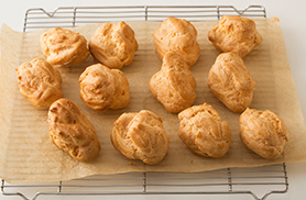 焼きあがったシュー皮はケーキクーラーの上で冷まします。