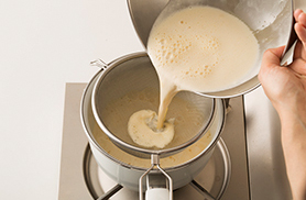 ざるでこして鍋に戻します。中火にかけてゴムベラで混ぜます。