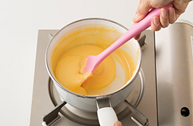 とろみがついたら弱火にし、さらに底からかき混ぜ続け、ダマがなくなりなめらかになるまで加熱します。全体にまとまってツヤが出てきたら出来上がり。