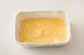 火を止めてバニラオイルを加えて混ぜ,容器に移し入れてラップをクリームに密閉させてふたをし、氷水の上に置きあら熱をとり、冷蔵庫で冷やします。