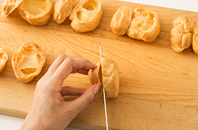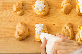 切ったシューの下の部分にカスタードクリームを絞り入れ、上にホイップクリームを重ねます。