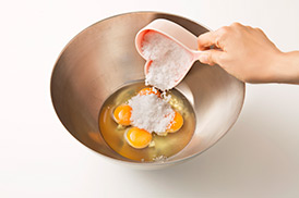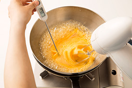 温まった生地をさらに泡立てるよ!ここがふわふわのスポンジケーキを作るポイントなんだ。泡立て方が足りないと、うまく膨らまないよ!