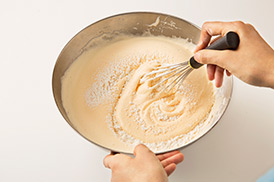 生地の量に対して粉の量が少ないので、泡立て器でぐるぐると混ぜ合わせてOK!生地と粉をしっかり混ぜ合わせて、均一な状態にするよ!