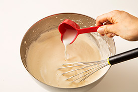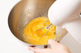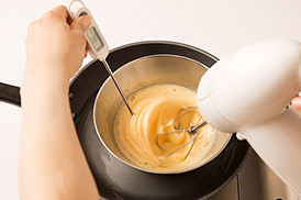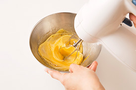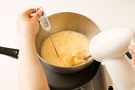温まった生地をさらに泡立てるよ!ここがふわふわのスポンジケーキを作るポイントなんだ。泡立て方が足りないと、うまく膨らまないよ!