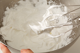 ボウルに油分や水分がついていたり、卵白に卵黄が混じっていたりするとしっかりと泡立たなくなってしまうから注意だよ!