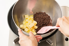 ボウルに板チョコAとバターを入れ、大きめのフライパンに水を入れて火にかけ、