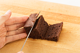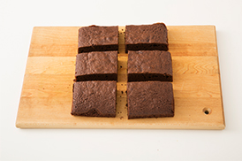 ブラウニーのオーブンペーパーを取り、6等分したら、そのうちの1つをさらに半分に切ります。2つのうち片方を三角に切り落とし、もう一方に重ねておうちをつくります。板チョコBは、屋根の大きさにあわせて切ります。