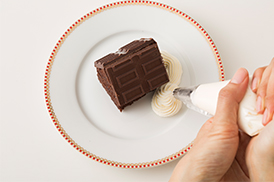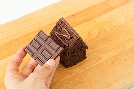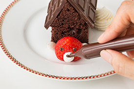 チョコレートペンの先を切り、<07>で切ったした2つのブラウニーと、板チョコBの屋根を貼り付けて、おうちを組み立てます。