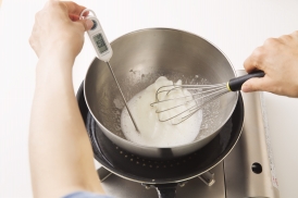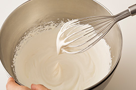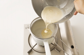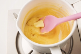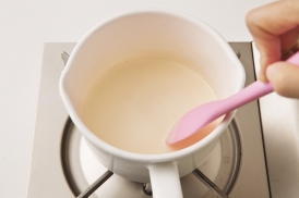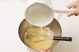 温かい牛乳を一気に加えると、卵黄が固まってしまうよ!少しずつ入れようね!