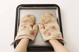 オーブンから取り出した天板は、とても熱いよ!手で触れないように注意しながら作業してね!