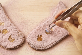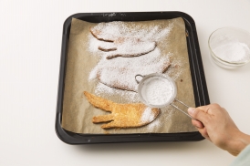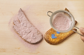 型紙を外すときは、型を抜いた部分に粉糖がこぼれないようにピンセットなどを使ってそっと平行に移動させてね。