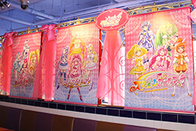 歴代プリキュアシリーズの装飾がほどこされた店内には、フォトスポットとしてプリキュア達が飾られた特大ケーキオブジェが設置もされております。