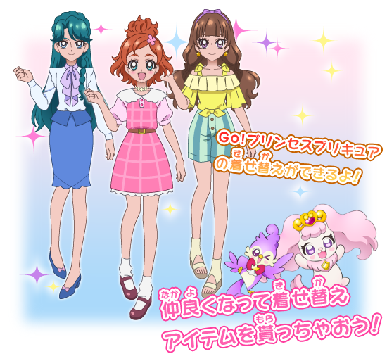 ロングドレスでキラキラと華やかなドレスを身にまとった美しい「お姫様」は女の子の永遠の憧れ。 今回のプリキュアは、そんな女の子の憧れであるプリンセスになって戦い、それぞれのプリキュアが、花・海・星の力を持つプリンセスとして力を発揮します。 さらに、きめ技を放つ時には、プリンセスらしい華麗なロングドレス姿へと変身します!