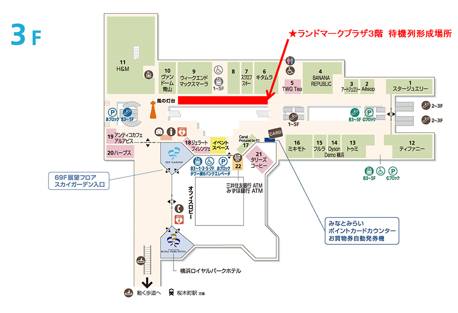 - 待機列にお並びいただくにはランドマークプラザ3階通路にて列形成された待機列所にお越しください。