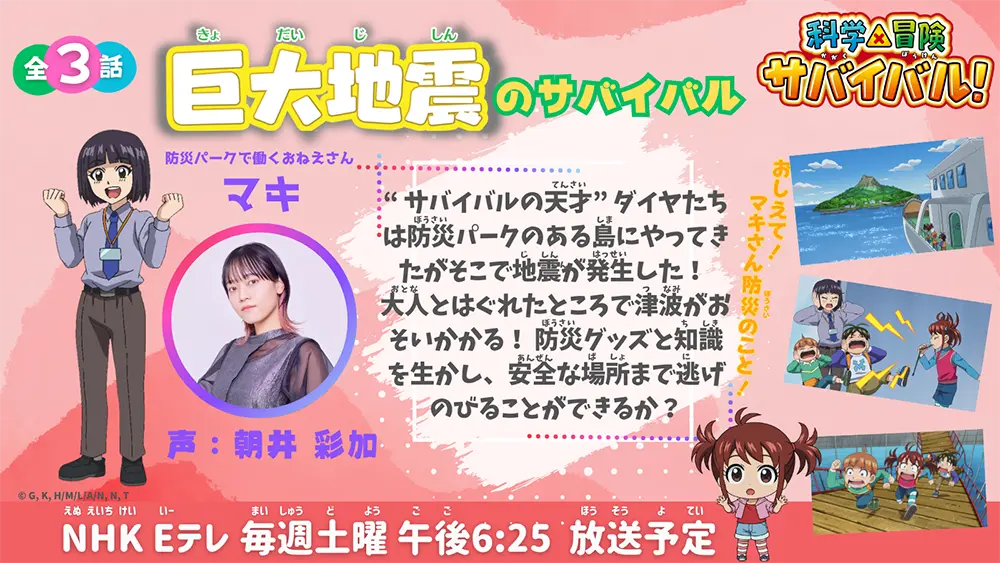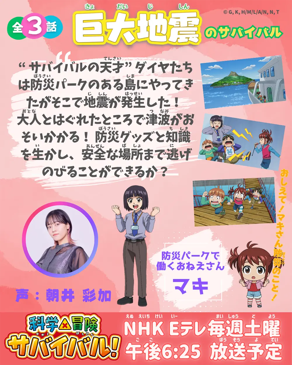次回からの放送は「巨大地震のサバイバル」 ダイヤたちがおとずれたのは、火伏島にある防災パーク! そこではたらくマキさんを演じるのは、朝井彩加さんです。 巨大地震のサバイバルは全3話!お楽しみに~