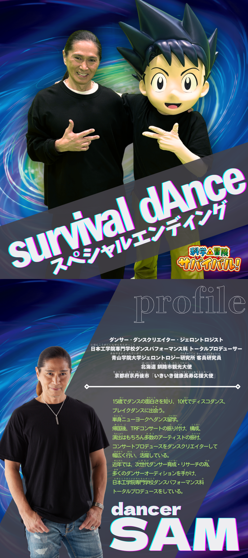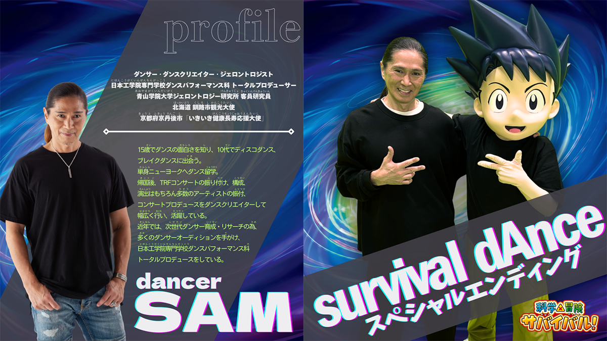 SAMさんと ジオ、夢のコラボが実現! 今回はテレビアニメ「科学×冒険サバイバル!」エンディングテーマのダンスを、ジオと一緒におどってくれたよ! 「survival dAnce 〜no no cry more〜」はSAMさんが1994年にTRFのメンバーとして初めてオリコン1位を取った曲なんだって♪ みんなもSAMさんとジオみたいに「survival dAnce」をかっこよくおどっちゃおう!