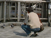 この日は、気持ちの良い 秋晴れの空でした。写真は 西日暮里駅前で鳩とたわ むれる西沢監督。 (写真・上)