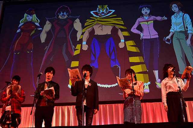 その後、「タイガーマスクW」が4月より第3クールに突入するにあたり、新ビジュアルを公開。さら会場にいる観客全員で、今後アニメで使用される「試合のガヤ収録」を実施しました!『タイガー!!!』『新日本!!』『がんばれー!』など様々な声援が会場中から飛び交い、ステージでそれを受ける5人は「本当にプロレス会場にいるみたい!試合したくなるくらい迫力がすごい!」と盛り上がり、特に三森さんと橘田さんはお互いプロレスごっこを始めるなど終始興奮気味の様子でした。