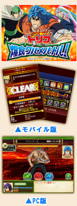 トリコ 爆食グルメバトル! (PCブラウザゲーム) 【提供サイト】Yahoo! Mobage URL:http://tbg.bandainamco-ol.jp/ ご注意:ゲームを遊ぶにはYahoo! JananIDが必要です。 【プレイ料金】 基本プレイ無料(一部有料アイテム販売あり) (モバイル版) 【提供サイト】Mobage URL:http://wpp.jp/toriko/ ![]() ご注意:ゲームを遊ぶにはMobageへの登録が必要です。 【プレイ料金】 基本プレイ無料(一部有料アイテム販売あり) |