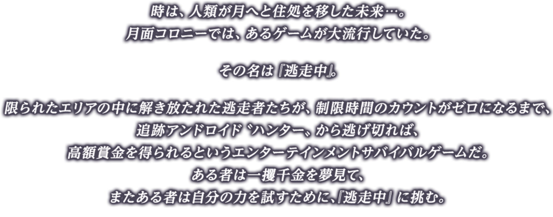 『逃走中』の絶対王者。28歳。 超人的な身体能力と的確な判断力で、幾度となく逃走成功を達成している大スター。 巨万の富を得ており、抜群の人気を誇る。 颯也の憧れの存在である。