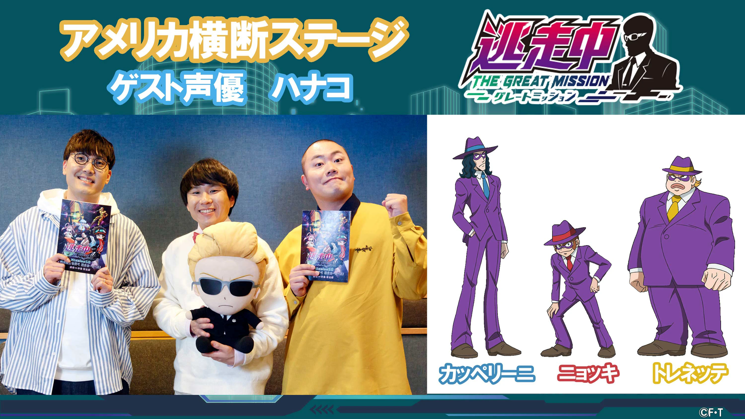 4月7日(日)放送のMission50「謎の美女を運べ 爆走カーレース!」からゲストとして声優を務めるのは、大人気お笑いトリオのハナコ!今回が声優初挑戦となる。バラエティーだけでなくドラマにも出演する演技力も持ち合わせた彼らが務めるのは3人のマフィアたち。悪そうな“見た目”をしながらも愛嬌たっぷりのキャラクターを演じる。3人らしいチャーミングなマフィアたちに乞うご期待!