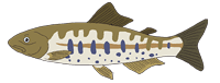 渓流の女王ヤマメは、イワナより下流の方を好んで住む渓流釣りの好対象魚。体にはパーマークと呼ばれる小判型の斑紋がある。釣るにはポイントが大事、岩などで流れの巻き返しがゆるやかになった所や本流の脇の石陰のようにエサがたまっていそうな所を狙おう。 |