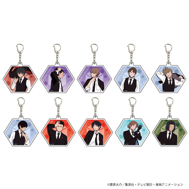 アクリルキーホルダー スーツver.(描き下ろし)(ブラインド) 価格 各858円 発売日 2022年2月16日 コンプリートBOX:8,580円(税込)ダイカットで切り出し印刷と加工を施したアクリルキーホルダーです。裏は無地の白となります。 詳しくはこちら GOODS 一覧へ