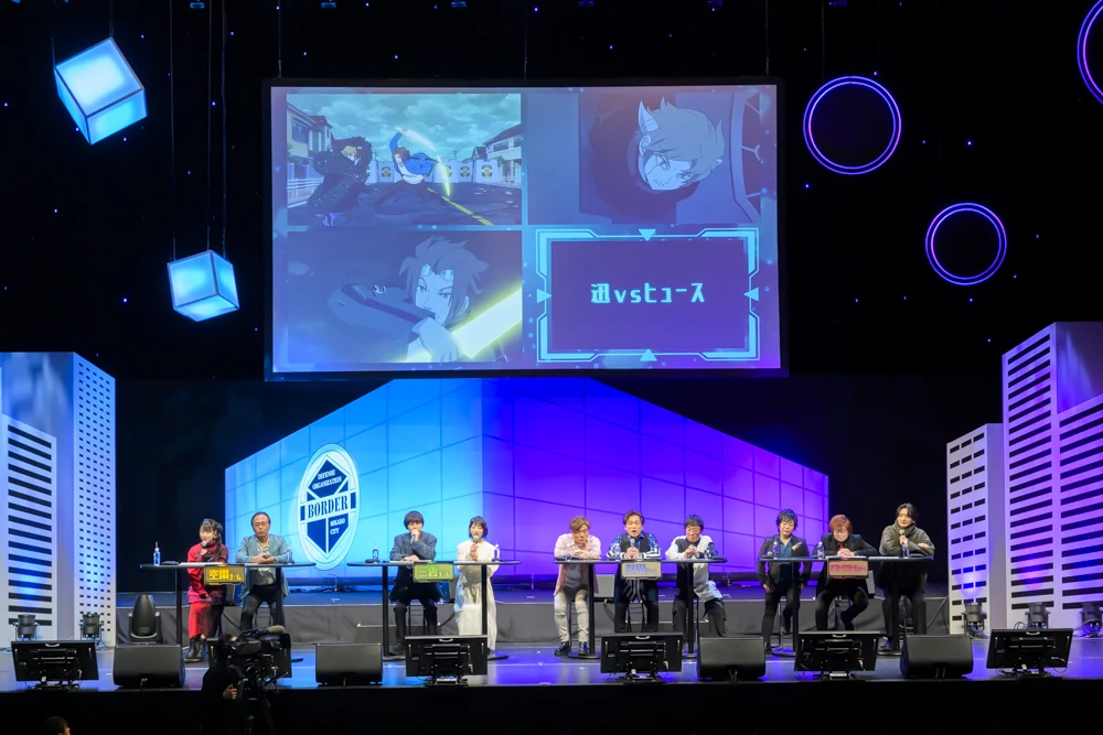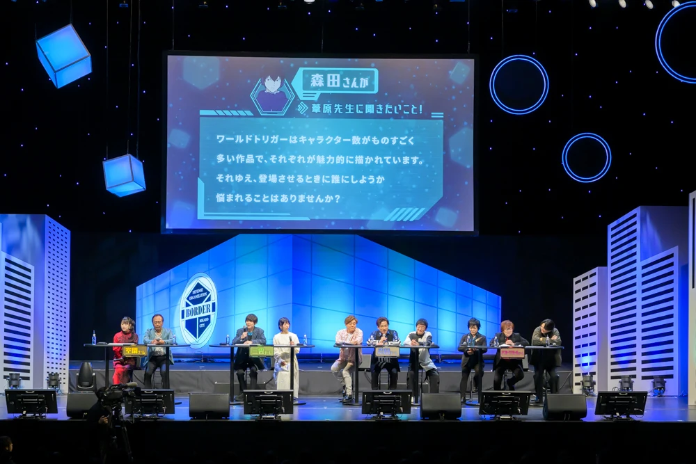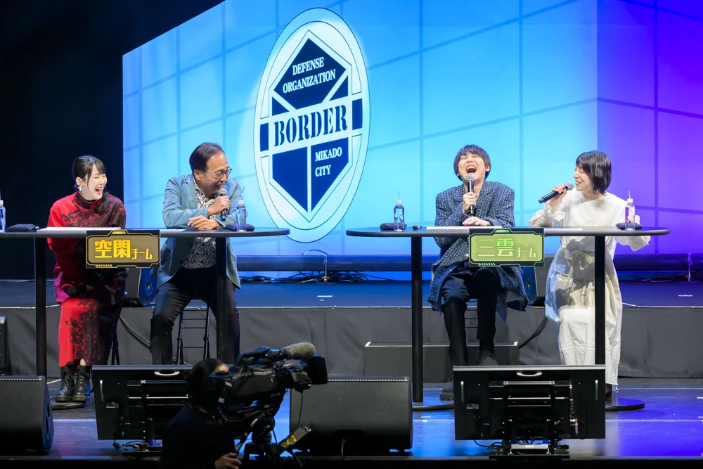 オープニングトークのあとは、毎年恒例の人気コーナー「ワールドトリガー・ステーション」。関係者たちやキャスト陣の質問やアンケートをもとに、『ワールドトリガー』にまつわる話題を深掘りするこのコーナー。今年は出演キャストたちのアフレコ時のエピソードや、大規模侵攻編の話題が中心となって展開されました。キャスト陣が村中さん・田中さんの「空閑チーム」、梶さん・田村さんの「三雲チーム」、草尾さん・森田さん・沼田さんの「忍田チーム」、佐々木さん・古川さん・島﨑さんの「アフトクラトルチーム」に分かれて着席すると、早速最初のテーマ「忘れられない印象的なエピソード」のトークが始まります。