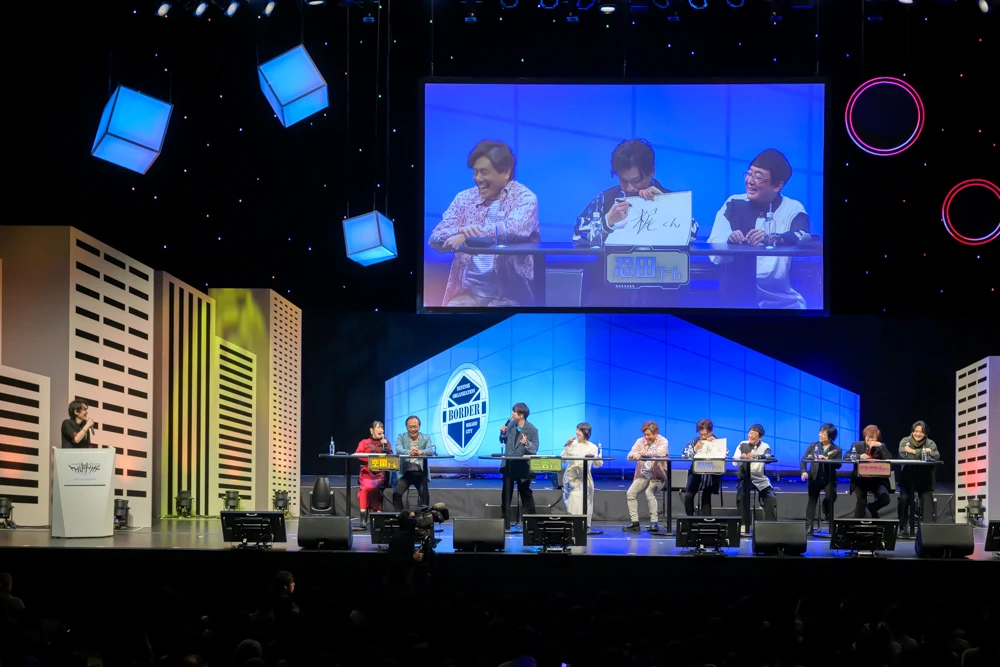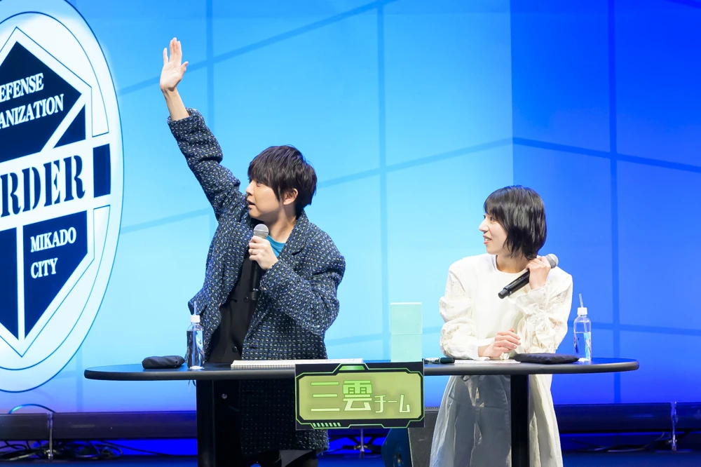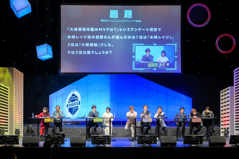 「ワールドトリガー・ステーション」の締めくくりは、4チーム対抗クイズ。出演者へのアンケートをもとにした問題で、正解したチームはトリオンキューブを獲得。合計数の多かったチームにこのイベントにちなんだ豪華賞品が贈られました。 第一問は「大規模侵攻編のMVPは?」というアンケートに対して、木崎レイジ役の前野智昭さんが選んだ内容から出題。「1位は木崎レイジ、2位は小南桐絵、では3位は誰でしょうか?」という難題に、各チームが相談しながら回答していきました。