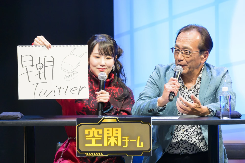 第二問、ミラ役の小堀友里絵さんの「忘れられないエピソード」をもとにした「当時ワイワイしていて楽しかった思い出は何でしょうか?」という出題には、「X(旧Twitter)のリアタイ実況」という回答で満場一致。アフトクラトルチームは「(古川さんが)ちゃんと目覚まし時計をかけて朝のリアタイをしていた」ということを主張しますが、残念ながら追加の点は得られなかったという一幕も。