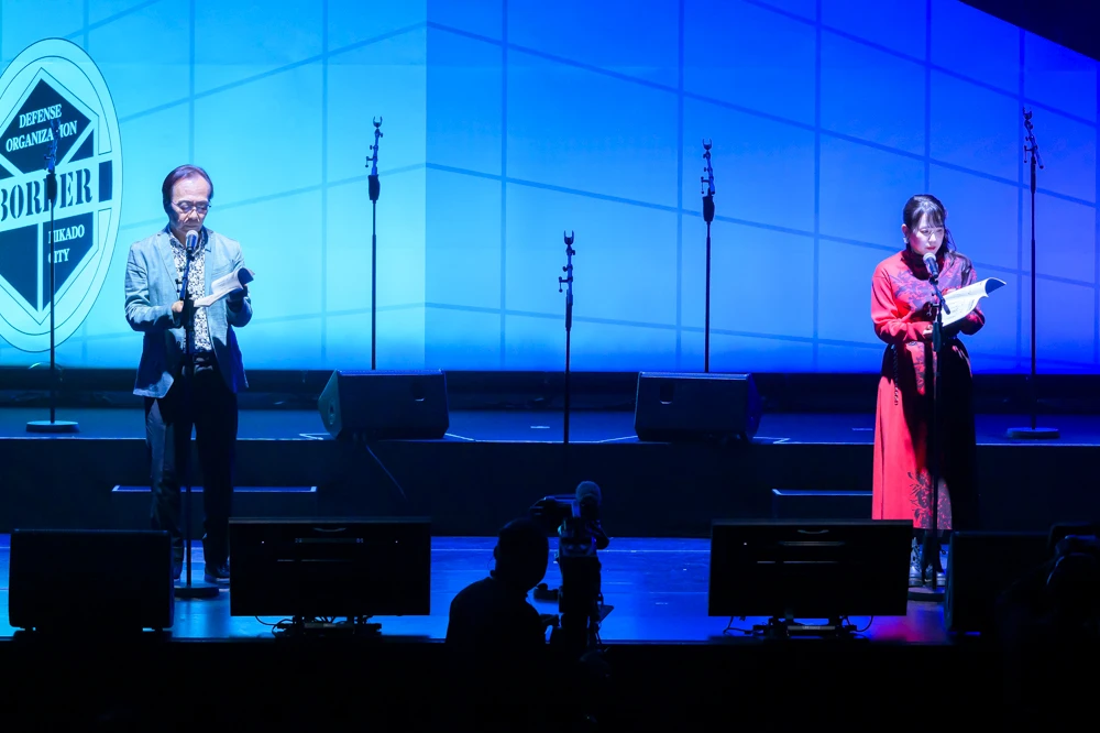 一転して、生アフレコは真剣そのものの臨場感あふれるステージに。昼公演と違った構成で、柳田さんがランバネインの戦闘を迫力の低音ボイスで演じきると大きな拍手があがります。忍田本部長の「旋空弧月」が飛び出すシーンでは、草尾さんの声の魅力に客席から黄色い悲鳴が上がる一幕も…! 最後は村中さんが「原作、アニメ、舞台、色々なところで展開する『ワールドトリガー』をこれからもぜひ愛していただければと思います」と感謝の言葉を語り、梶さんはイベントが終わる寂しさを口にしながらも「『ワールドトリガー』をみんなで一緒に応援していきましょう」と述べ、おなじみの「トリガーオン!」の掛け声でイベントを締めくくりました。