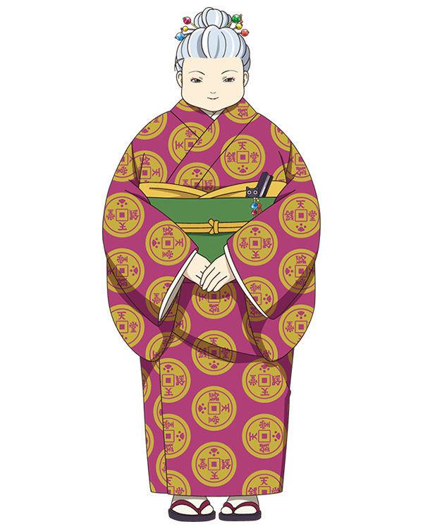 銭天堂ぜにてんどうの店主てんしゅ。年齢不詳ねんれいふしょう。結ゆいあげた真まっ白しろい髪かみに、真まっ赤かな口くち紅べに、古こ銭せん柄がらの赤あか紫むらさき色いろの着物きものが特とく徴ちょう。店みせにおとずれる客きゃくの願ねがいを察さっして、望のぞみの駄菓子だがしをすすめる。