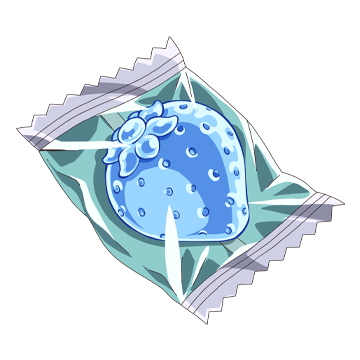 食べるとたすけを必要としている幽霊によりそう力がそなわる、水色のいちごあめ。
